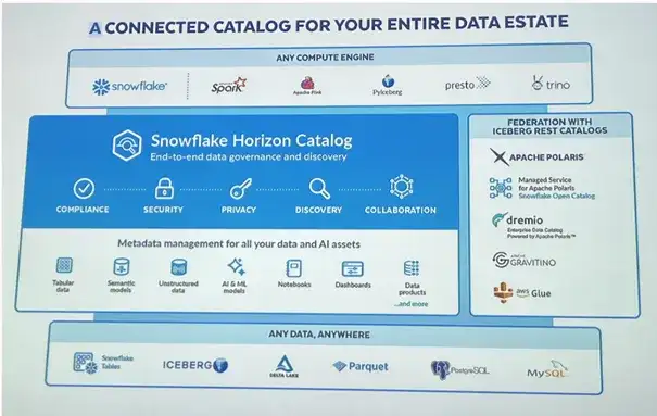 Snowflake 推出了面向企业级的数据治理工具:Horizontal Catalog(横向目录服务)。该服务不同于开源版本的 Platform Rust,专为企业客户设计,强调安全性、合规性与资源统一管理。它不仅支持对传统数据表的编目,还覆盖 AI 模型、Notebook、数据应用等各类资源,同时支持与外部目录系统(如 AWS Glue、DataHub 等)进行联邦集成。Horizontal Catalog 的出现,标志着 Snowflake 正在逐步完善其数据治理能力,构建统一的数据资产视图,满足大型企业在安全与监管方面的高标准需求。
