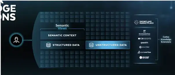 在数据协作方面,Snowflake 对Marketplace 能力进行了升级。过去的 Marketplace 主要用于结构化数据集的交易和共享,而现在新增了 Semantic Context(语义上下文)功能。开发者可以在 Semantic View 中定义维度、指标、实体关系等语义信息,从而让 AI 更准确地生成查询语句,提升“理解数据”的能力。这为 Agent 理解业务语言、调用数据资产提供语义支撑,极大降低 AI 应用的数据门槛。