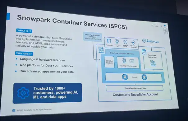 支撑这一切的,是底层的Snowpark Container Services(SPCS)。它是一个 Serverless、支持 GPU 的计算运行时,允许 AI 应用、模型推理服务、定制 Agent 等在其中运行。SPCS 不仅提供弹性扩缩容能力,还具备调度逻辑、权限控制与容器间通信能力,为企业部署生产级 AI 应用提供强大支撑。