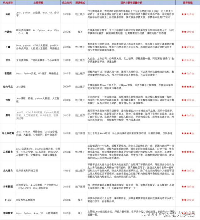 市面上几乎所有机构老师在b站或者51cto等平台都有一些小额免费课,可以找一些资料听一听老师的水平。同时有些机构的老师可能头衔很厉害,某某大学的博士,出版某某书籍等等,但是没有在企业就职过,这些老师也要慎重考虑。
