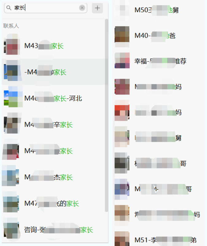 下面这些是范老师的微信通讯录,把“家长”做为关键词,能搜出来很多学生家长的微信,范老师除了督促学生,还会时不时的跟家长保持沟通,了解学生的情况,为家长提供更好的建议,做好家校共育。(PS:通过学生允许后,与家长保持联系,目的为了同学更好的完成学业实现就业涨薪。)