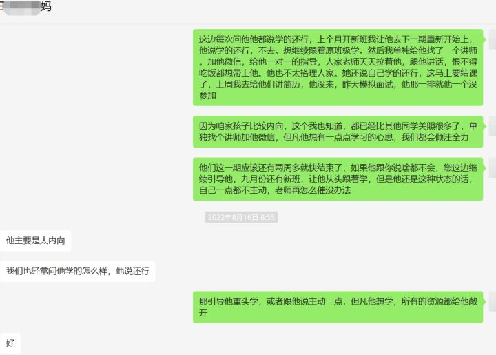 班主任的服务如何,从班主任的通信录可见一斑。翻看范老师的通讯录,里面不光有学员的联系方式,就连家长的联系方式也保存了很多,她们不光经常与学生沟通交流,与家长之间的沟通也从未间断过。