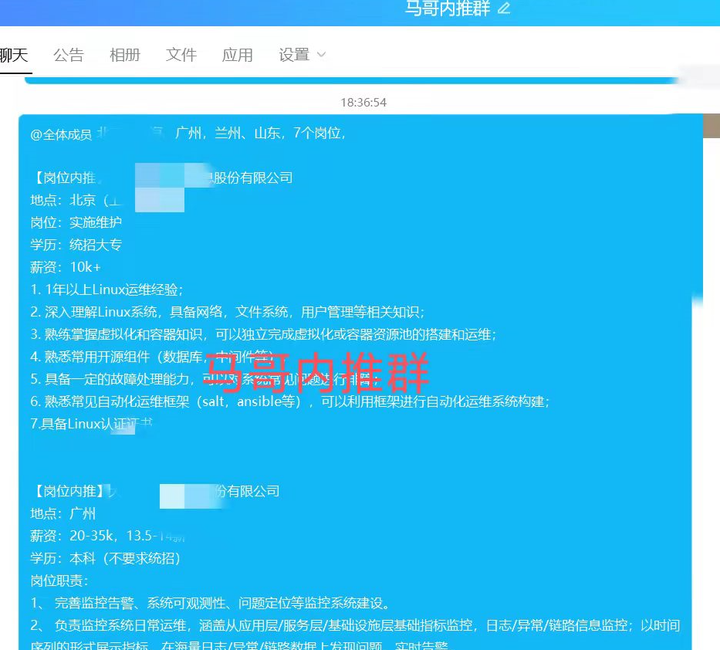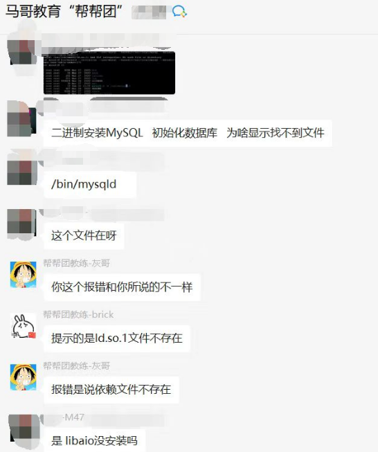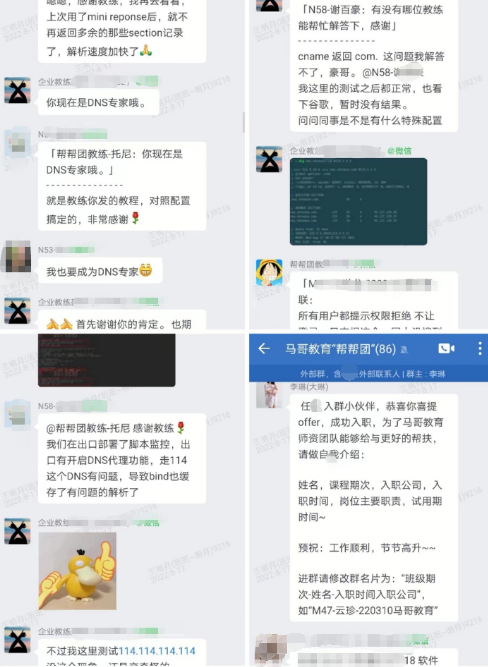 帮帮团就是专门为了解决这些问题的,只要凭借入职offer就能让班主任拉你进群,这里有马哥教育企业教练,也有其他运维同好,有工作上的问题都可以在这里询问,大家会一起帮你解决,直到你”坐稳位子“,顺利转正。