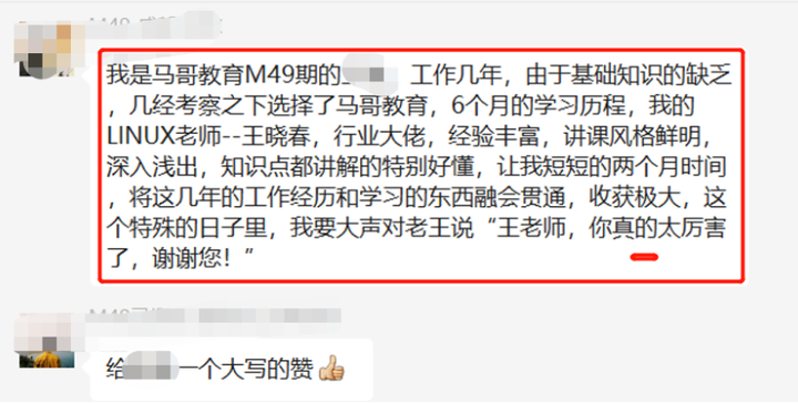 很多人在报名学习马哥教育的课程之后,人生都获得了翻天覆地的变化,他们有的从0-1成功入行互联网行业,有的成功度过了职场瓶颈期,有的一毕业就找到了满意的工作。有的学员还把自己的故事写下来,希望给其他人一点启发和激励: