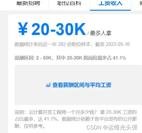 近些年,Linux云计算的人才缺口比较大,待遇也很高。参考招聘网站,Linux云计算开发工程师薪资区间在2—50K,其中拿20—30K的占比最多,达到了41%。