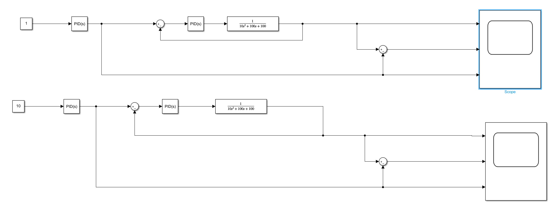 用constant与积分模块模拟不同速度输入命令,输入给相同的系统传函(PI控制器+plant),观察error的变化。仿真图如下所示: