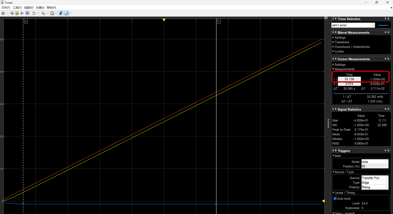 速度输入为1时结果如下,其中红色线条为输入命令,黄色为输出,蓝色线为速度 =1 时的error,error = 输出 - 输入;最终误差稳定在1
