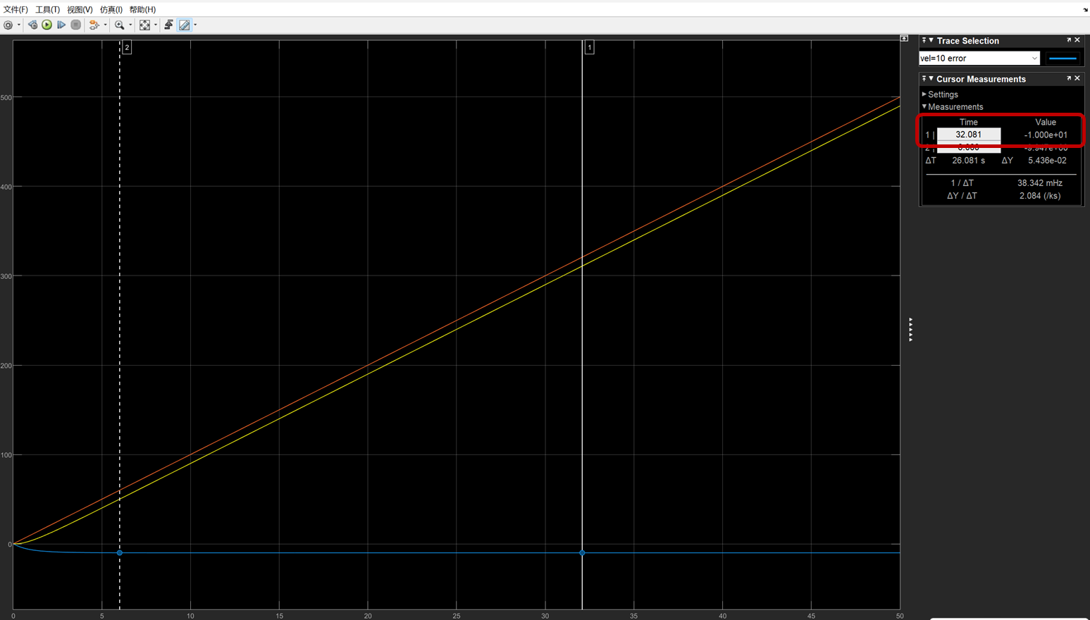 速度输入为10时结果如下,其中红色线条为输入命令,黄色为输出,蓝色线为速度 =10 时的error,error = 输出 - 输入;最终误差稳定在10