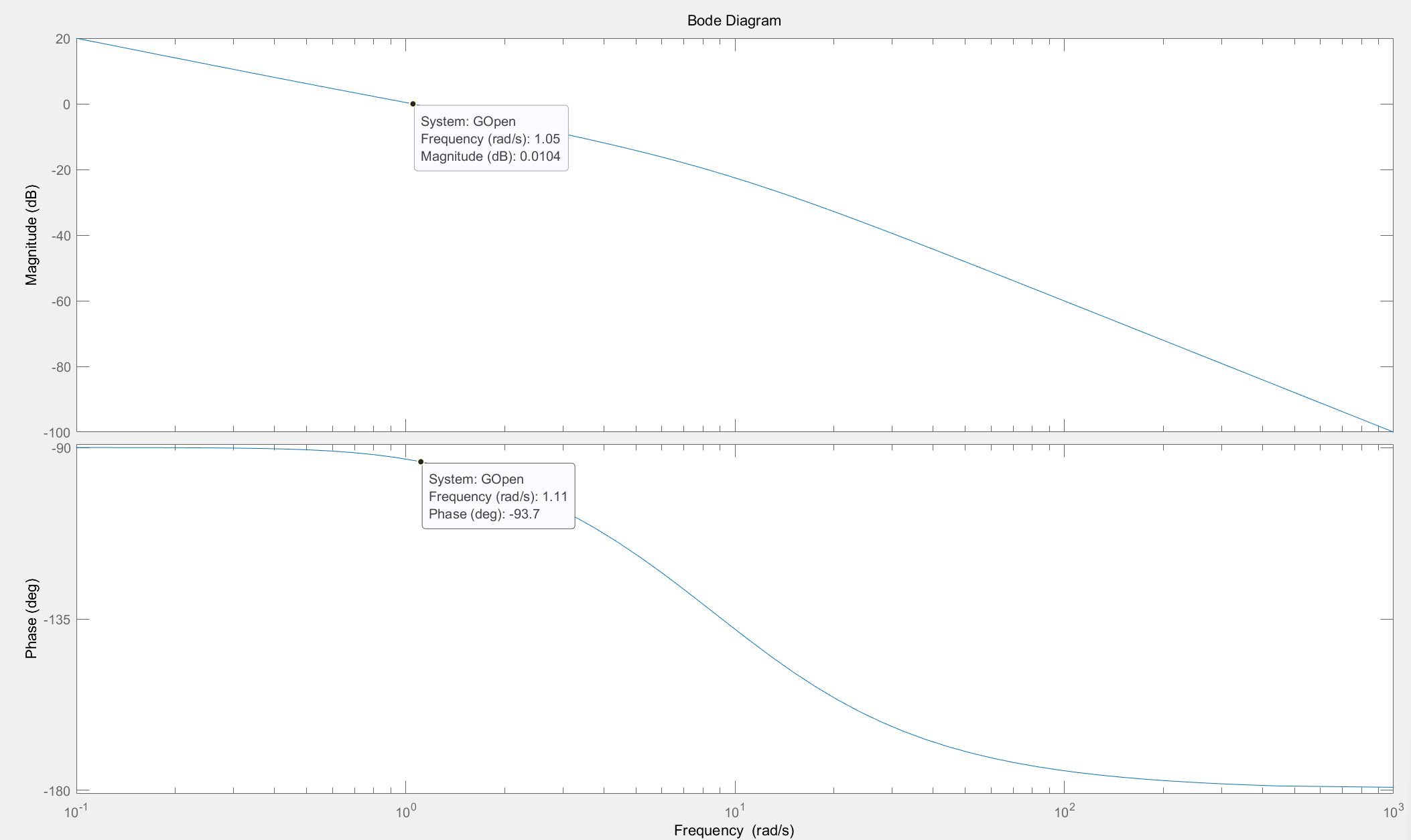 其中仿真的系统传函伯德图如下所示,系统带宽越1rad/s左右。