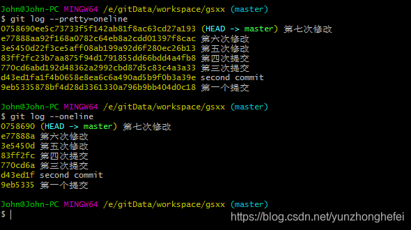 默认显示详细信息,篇幅较大,可以使用 --oneline来显示精简信息,oneline有两种用法:git log --oneline git log --pretty=oneline