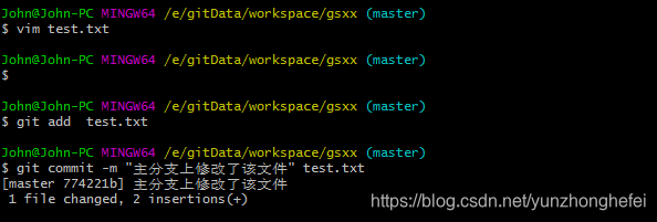 然后,执行合并操作,该合并操作可以在切换到主分支上进行,也可以在当前分支上进行,区别就是,在哪个分支上进行merge操作,该分支上完成后,即为最新的文件: