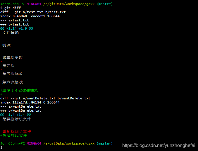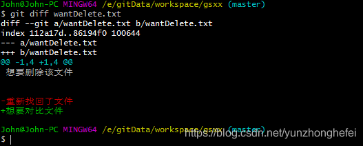 编辑wantDelete.txt 文件,删除一行,增加一行之后,使用diff对比该文件: