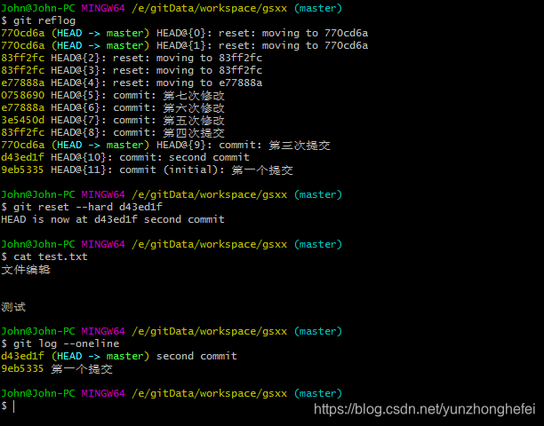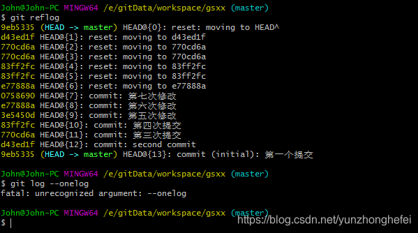 git reflog 显示全部的版本信息,git log --oneline 显示当前版本之后的所有版本,当前已经没有版本可以回退,使用git log --oneline 没有信息展示,但是 git reflog还是全量版本信息: