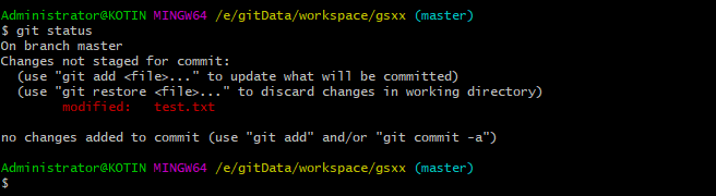 修改文件后,再次 git status 状态查看(仍然是红色提示,但是提示信息不同:modified):