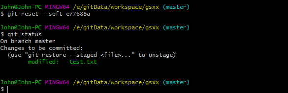 使用--soft回退到上一个版本,显示为绿色,此时cat test.txt 查看文件内容,发现内容并没有发生变化,但是状态发生了改变了,实际是因为本地库中的状态发生了改变,和工作区中的状态不再一致导致: