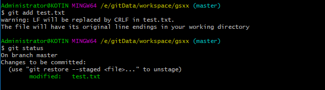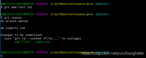 使用 git add 对文件进行追踪后,显示为绿色,此时文件被提交到暂存区(可以撤回):