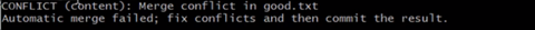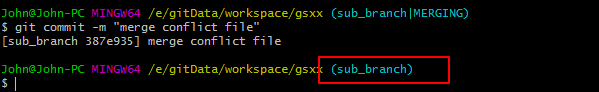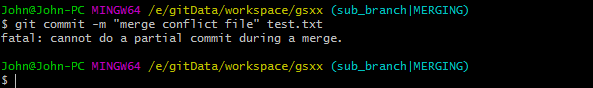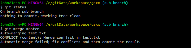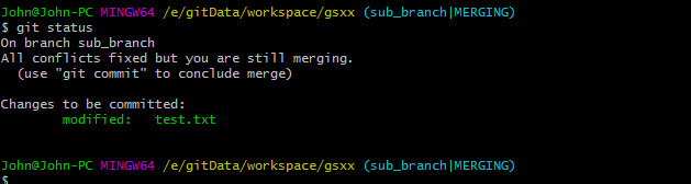 手动对该冲突文件进行修改,合并后(打开冲突的文件,删除多余的指示符,<<<<<<,>>>>>,=====。确定内容并编辑保存),使用git add 提交到暂存区: