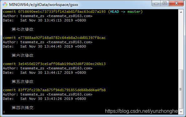 使用git log 可以实现git 版本的前进和后退,有多次提交版本的记录时,单屏显示不完时,使用空格来翻页,翻页结束后,可以按b来退出。
