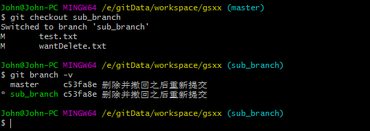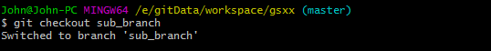 使用 checkout 来进行分支切换: git checkout sub_branch,绿色带*为目前所在的分支:
