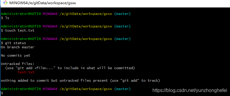本地创建一个文件,再次使用 git status 来查看状态,新增未追踪文件显示为红色: