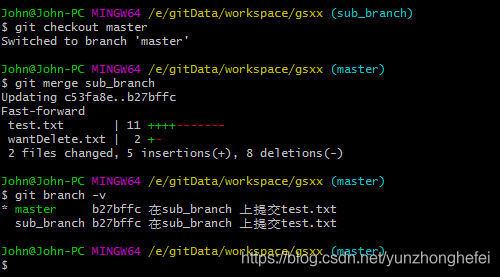 同步到主分支:此时如果想要将 sub_branch上的做的分支同步到 master上,必须切换到master分支进行操作。