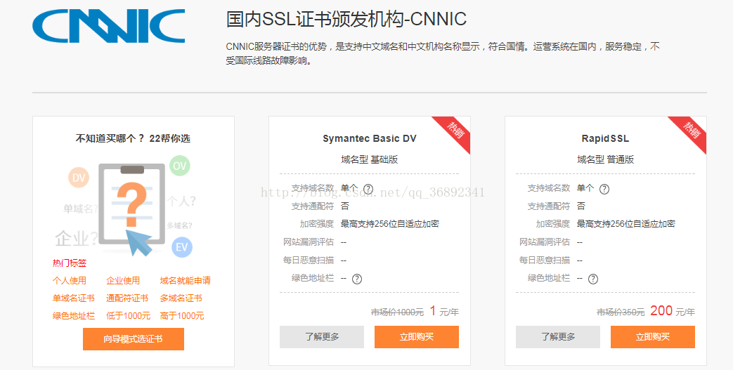 网上销售ssl证书的网站很多,价钱从几百到几千都有,由于楼主穷光蛋一个,只能申请一下免费的ssl证书,阿里云上面就可以申请数量有限的ssl证书。但本次楼主介绍的购买ssl证书是叫爱名网上购买的,如下图,按照爱名网上的步骤一步步来。