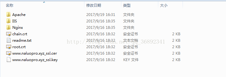 第二步:把下载下来的ssl证书解压,可以看到有Apache、IIS、Nginx几个文件夹,里面就是各个服务器要按照的安全证书了,这个时候我们就可以把安全证书放到我们的linux服务器上,如下图。