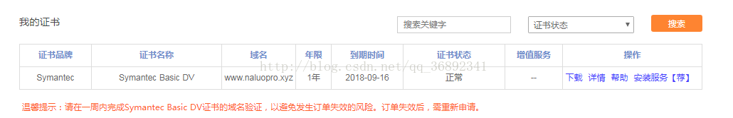 按照步骤购买成功,及绑定域名后,如下图,点击下载ssl文件