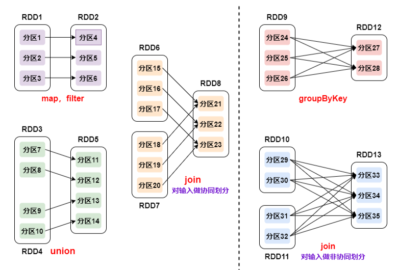 宽依赖:父RDD的一个分区会被子RDD的多个分区依赖,其中涉及到shuffle