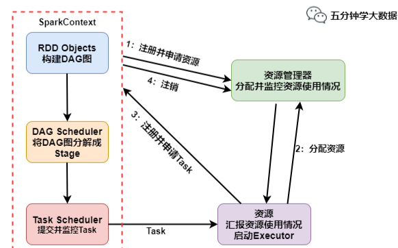 1.Spark Context向资源管理器注册并向资源管理器申请运行Exector