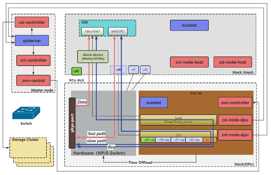 如上图所示,基于DPU改造后后,网络和存储都是从DPU卡接入的,DPU硬件支持数据包的高速处理和RDMA(远程直接内存访问)技术,提供对网络和存储的硬件加速能力。同时DPU集成了CPU核心,能够将OVS控制面卸载到DPU中,从而减少Host节点CPU的负载。为了把DPU接入K8S平台,需要使用基于DPU的