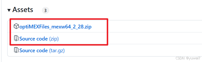 下载optiMEXFiles_mexw64_2_28.zip、Source code.zip两个压缩文件。顺便吐槽一下迅雷,100MB的文件,浏览器5分钟就能下载,它硬是花了25分钟。