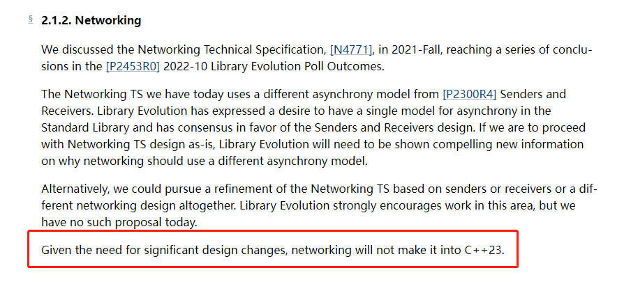 然后我去搜了一下,还是比较失望的,就连之前一直盛传的C++23即将引入官方的网络编程库,又要被放鸽子了。