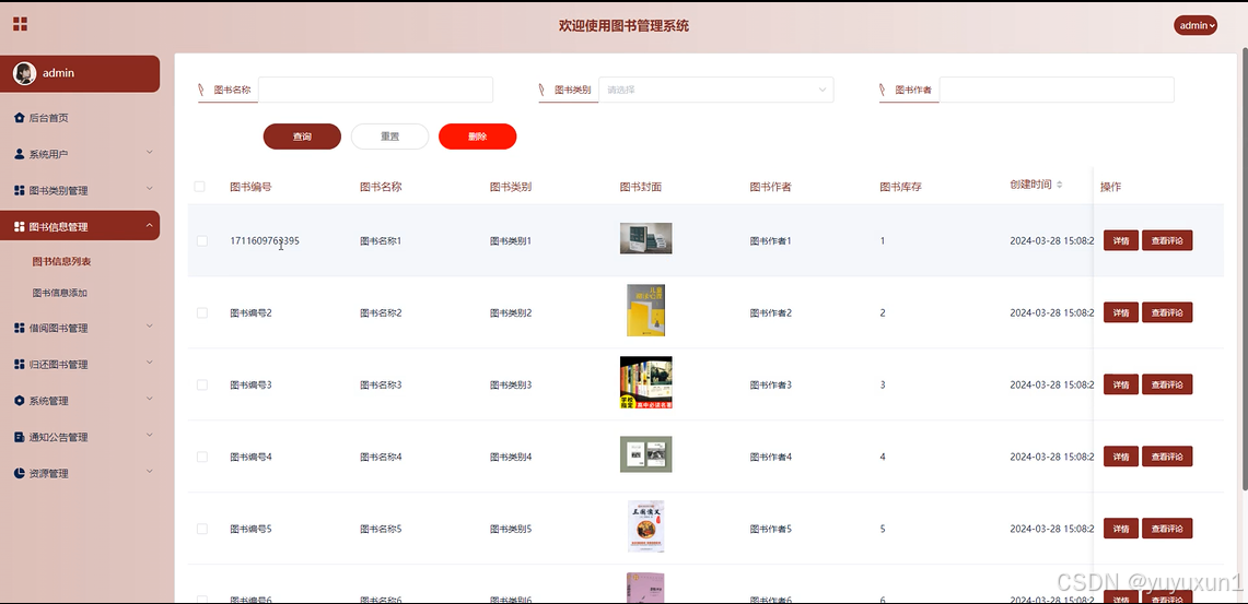管理员点击“图书信息管理”可管理景点的详细信息,进行增删改查等操作,还可以查看和回复用户评论界面如下图所示。