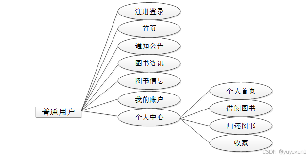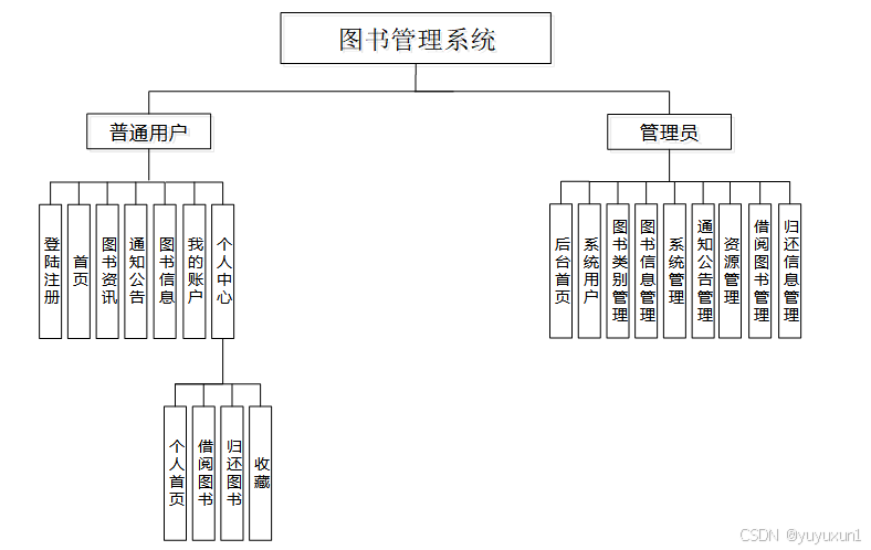 根据图书管理系统的角色,该系统被划分为普通用户模块、管理员管理模块。