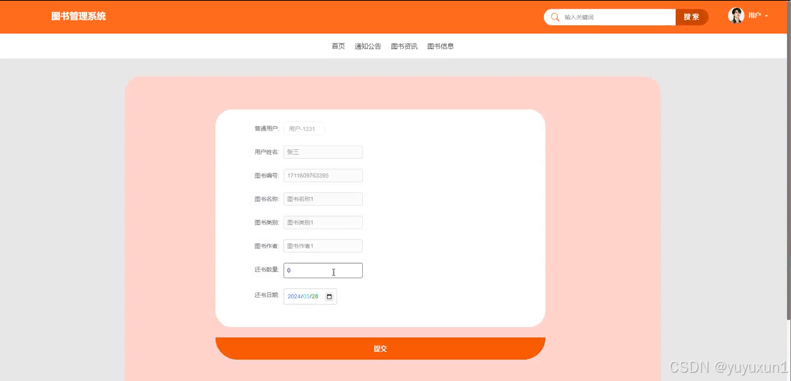 普通用户在图书信息详情页面点击归还可进入归还页面,用户填写相关归还信息点击提交即可,界面如下图所示。