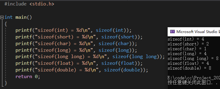 这里我们说一下, 为什么 long 类型的大小和 int 类型的大小是一样的, 因为C语言标准之规定了 long 类型是大于等于 int 类型的, 然而 int 类型是占 4个字节, 不同的编译器有不同的实现方式, 所以在VS2019中, long 类型的大小是4个字节