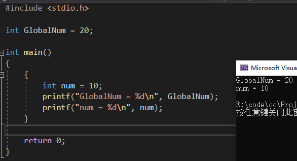 我们可以看到, 在代码执行到 定义 num 的 { } 花括号之后, num就不能再使用了! 但是全局变量 GlobalNum还是可以使用的.