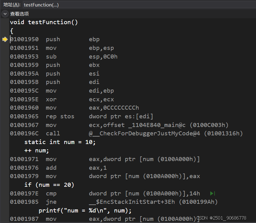 我们可以看到, static int num = 10; 这条代码是没有汇编语句的!为什么呢?直接说结论: