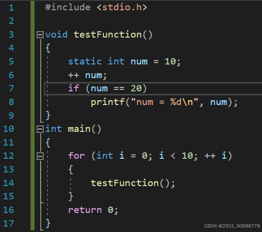 所以说,就算我们在main函数中调用10次 testFunciton() 函数,num 变量也只会在main函数执行前初始化一次!并且 这个被 static 修饰的局部变量的生命周期是随进程的!进程只要不死,这个变量永远都在(静态存储区中)。