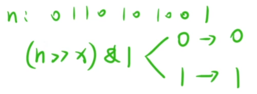 我们的做法是, 让这个二进制序列, 向右移x位, 之后&1, 看结果, 如果是1则为1, 如果为0则为0, 如下
