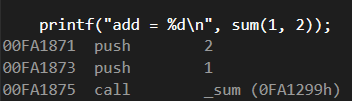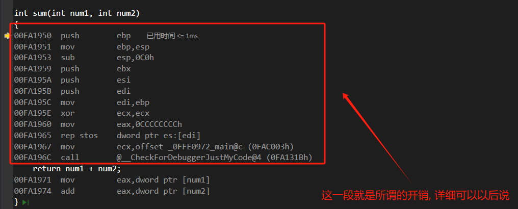 我们在VS2019 IDE中, 编写代码, 启动调试, 使用F11, 反汇编, 逐语句调试, 我们可以看到下状况(不会汇编没有关系, 这里主要是想让大家知道函数调用时候开销的), 我们能看到主调函数函数下一行代码的地址被压入函数栈帧中, 一些函数参数的传递, 以及函数返回时候返回到主调函数最开始压入的下一行代码的地址处.