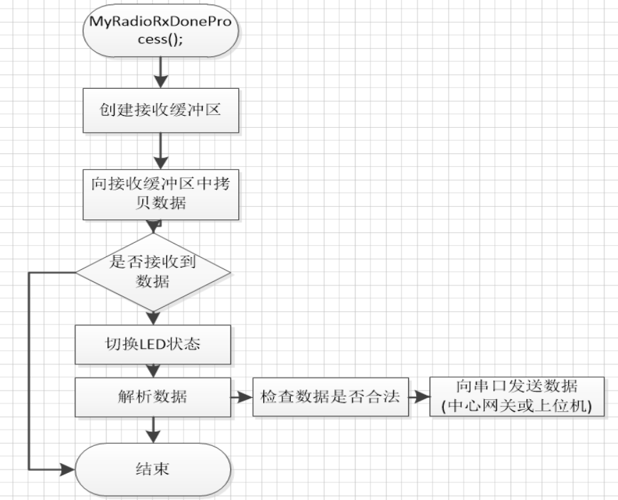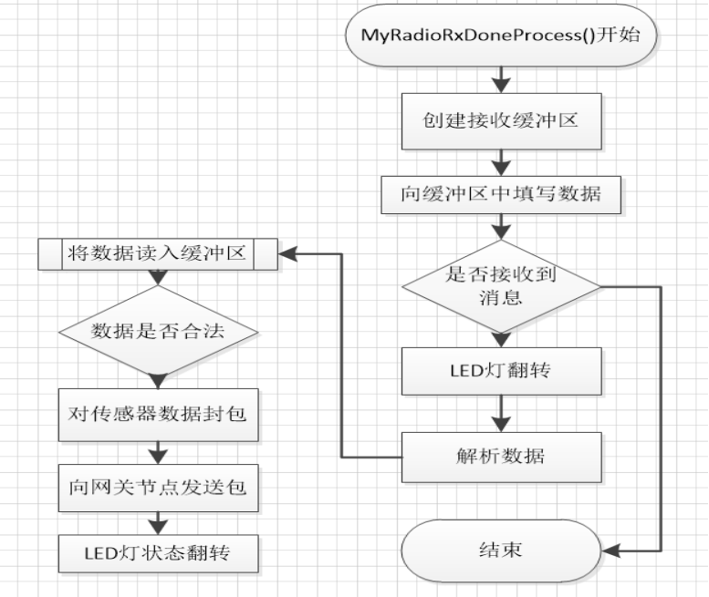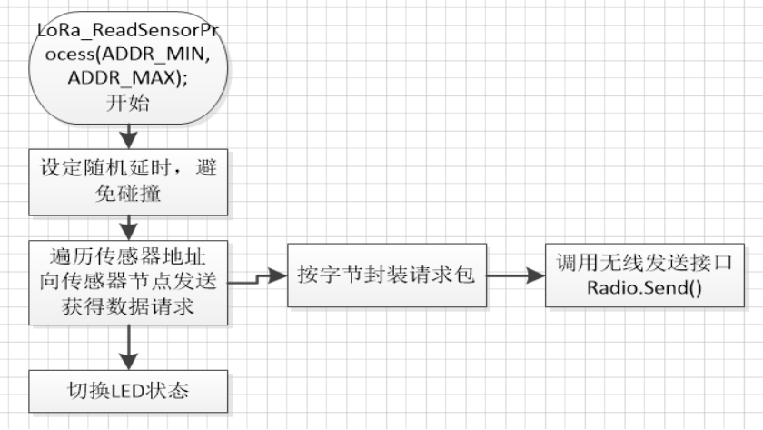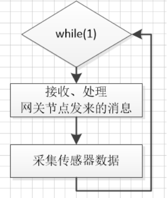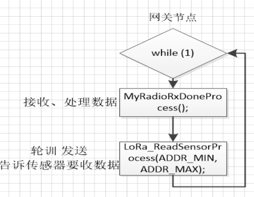 分析代码,请画出LoRa网关节点与两个采集节点通信的算法流程图