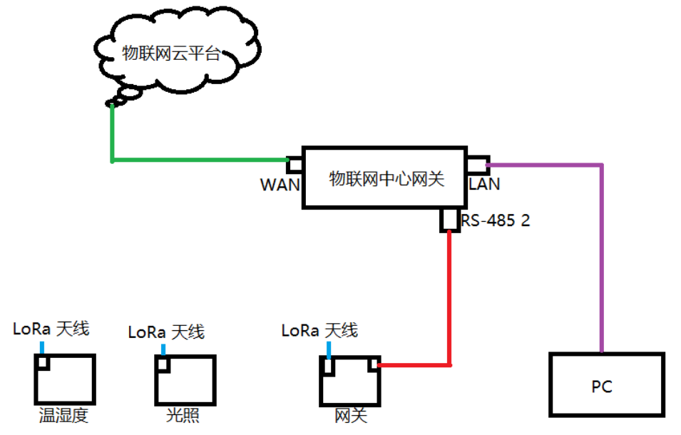 - 将Lora网关节点与物联网中心网关连接(注意检查拨码状态)