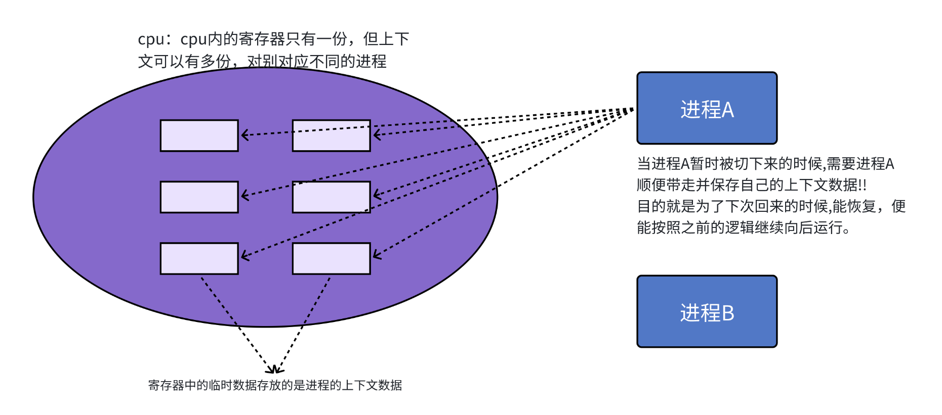 上下⽂数据: 进程执⾏时处理器的寄存器中的数据[休学例⼦,要加图CPU,寄存器]。
