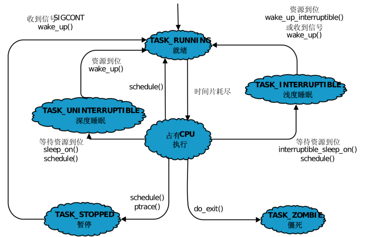 为了弄明⽩正在运⾏的进程是什么意思,我们需要知道进程的不同状态。⼀个进程可以有⼏个状 态(在Linux内核⾥,进程有时候也叫做任务)。下⾯的状态在kernel源代码⾥定义: