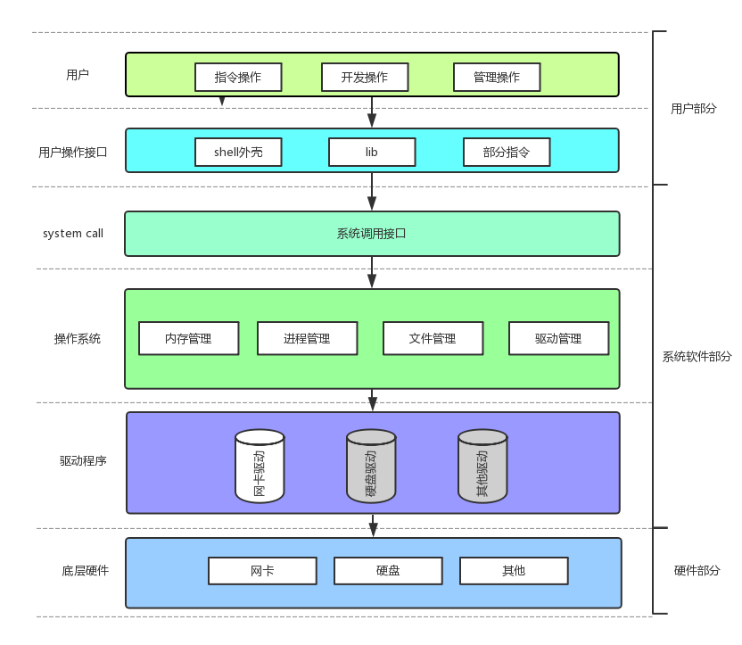 在整个计算机软硬件架构中,操作系统的定位是:⼀款纯正的“搞管理”的软件