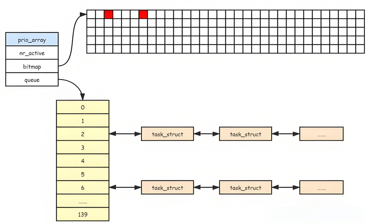 bitmap[5]:⼀共140个优先级,⼀共140个进程队列,为了提⾼查找⾮空队列的效率,就可以⽤ 5*32个⽐特位表⽰队列是否为空,这样,便可以⼤ 提⾼查找效率!