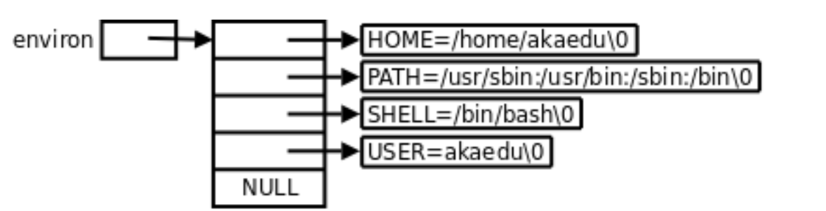 每个程序都会收到⼀张环境表,环境表是⼀个字符指针数组,每个指针指向⼀个以’\0’结尾的环境 字符串