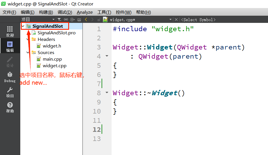 2、在 "widget.cpp" ⽂件中实现槽函数以及连接信号和槽